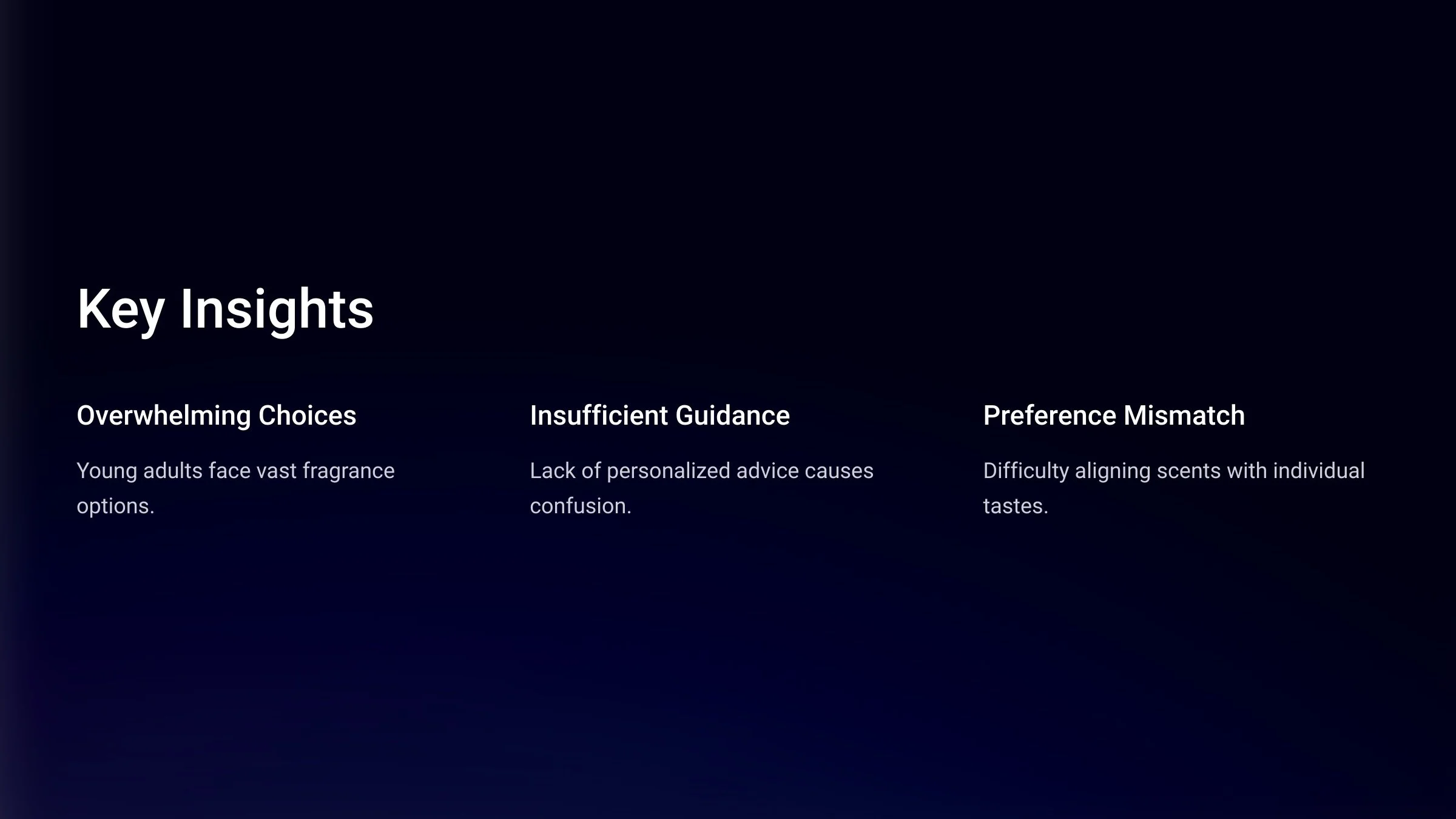 Young adults struggle with fragrance discovery due to overwhelming options and insufficient guidance, leading to confusion when choosing scents that align with their preference.